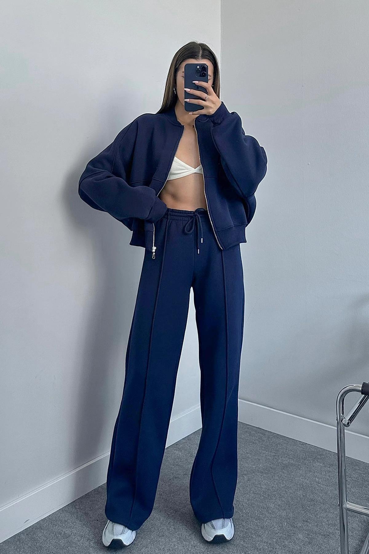 Bayan 3 iplik İçi Pamuklu Kışlık Eşofman Takımı Lacivert