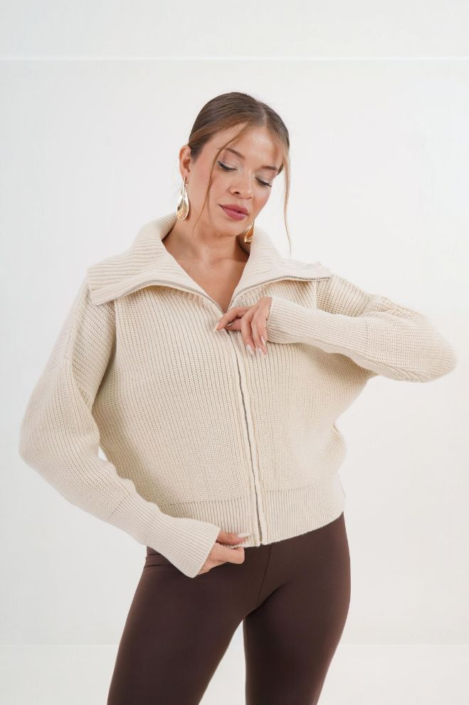 Bayan bej fermuarlı hırka, soft rengi ve modern tasarımıyla günlük kombinlerinize zarif bir şıklık katıyor.