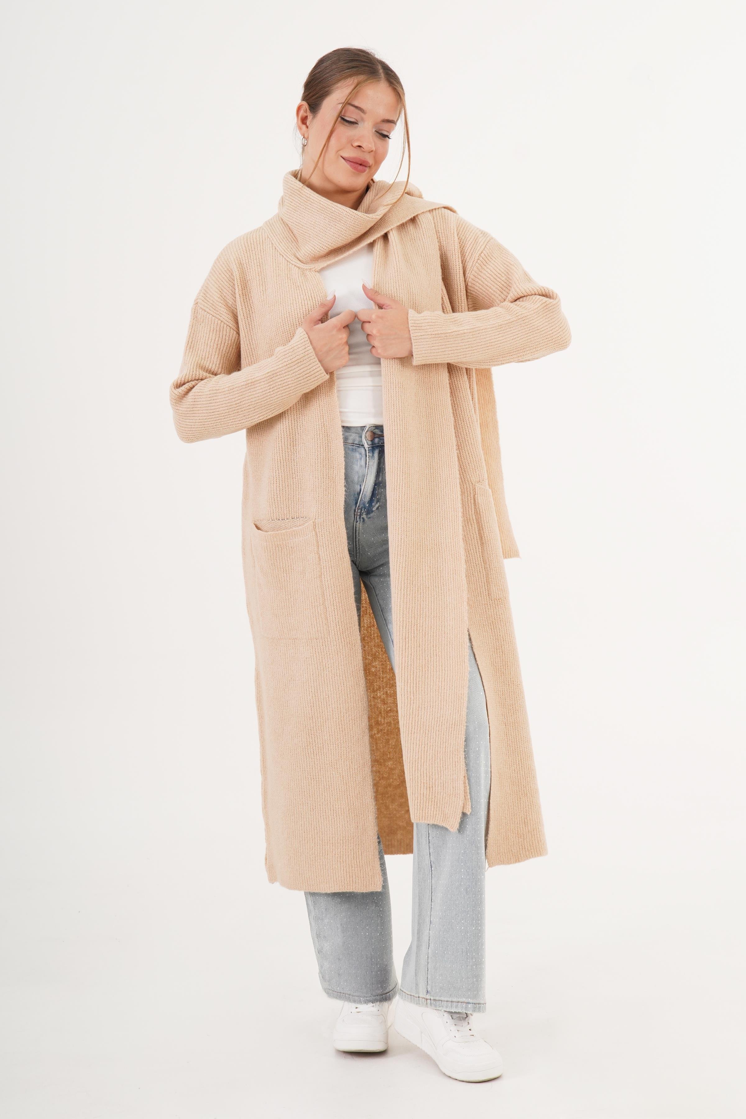 Bayan Bej Gündelik Zarif Atkı Yakalı Uzun Hırka Yama Cep İle