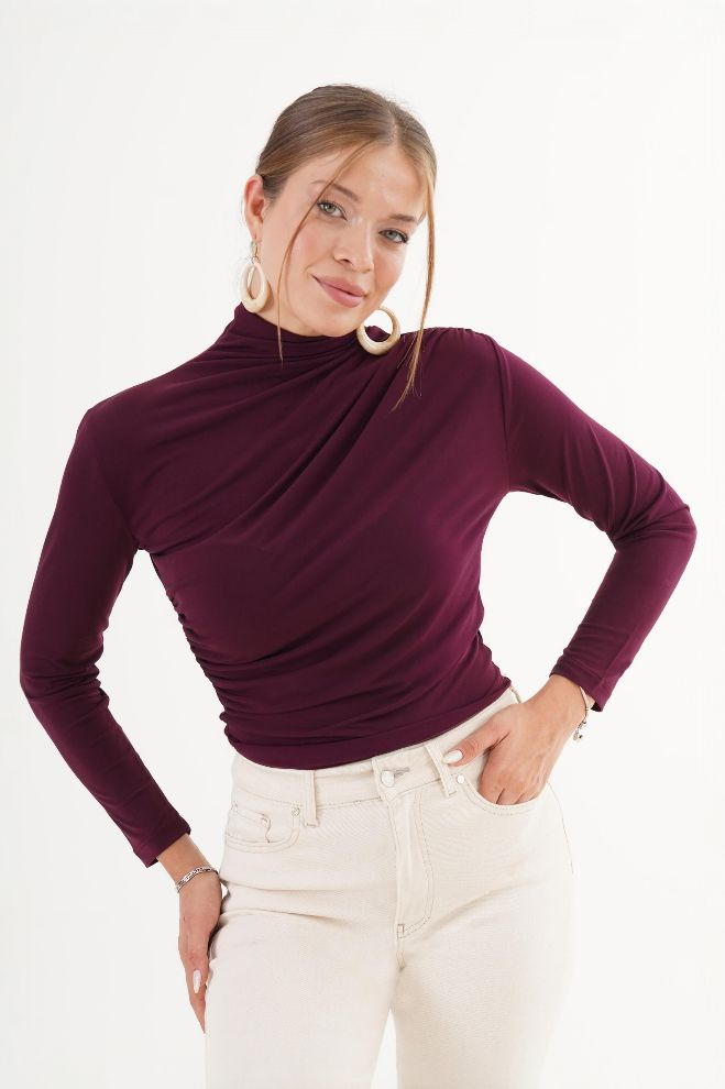 Bayan bordo zarif dar kalıp balıkçı yaka bluz, asil rengi ve modern kesimiyle kombinlerinize sofistike bir şıklık katıyor.