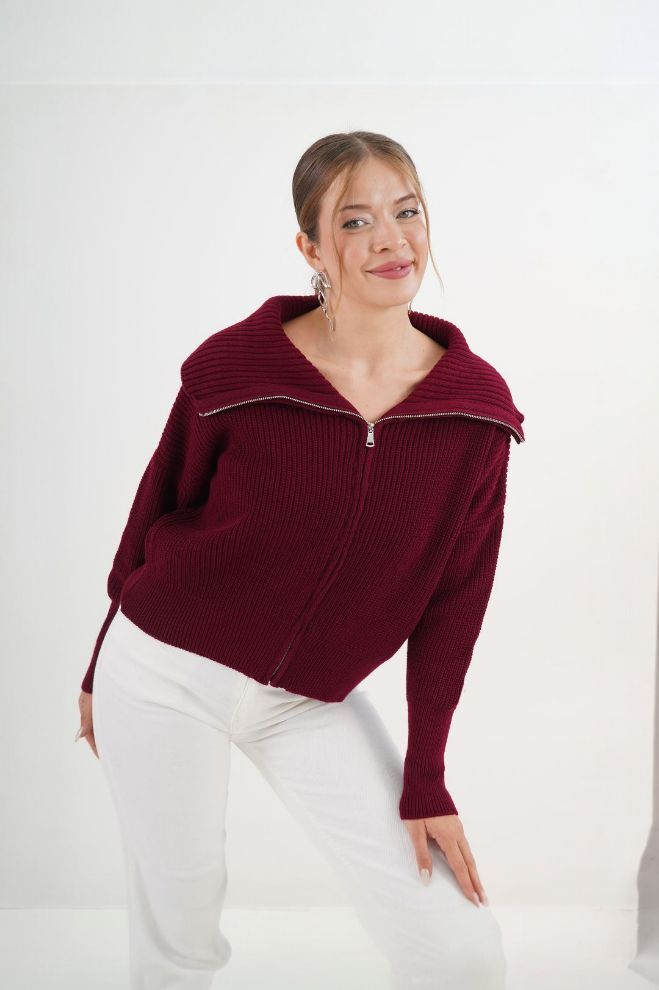Bayan bordo fermuarlı hırka, asil rengi ve modern tasarımıyla kombinlerinize şık bir dokunuş kazandırıyor.