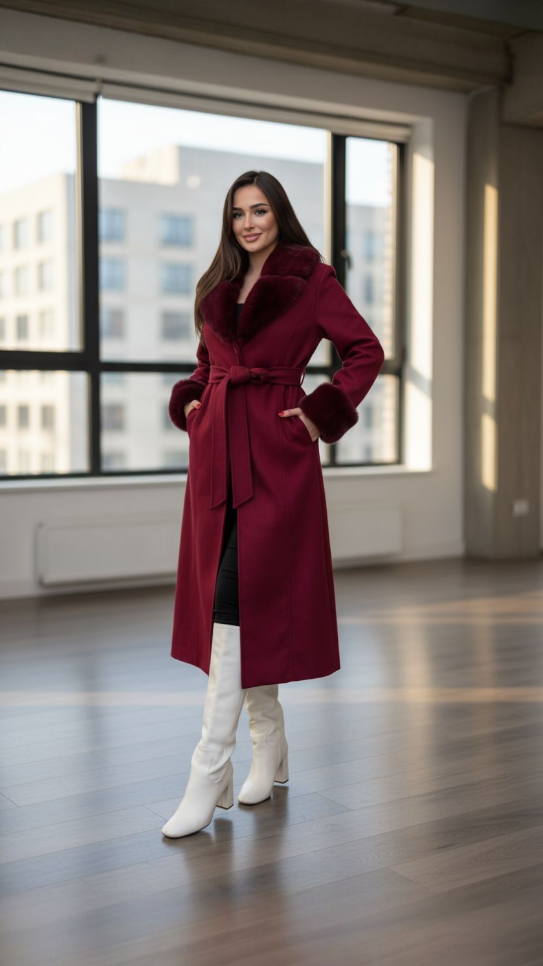 Bordo rengiyle asil bir görünüm sunan bu dar kalıp kürk anvelop kaban, soğuk kış günlerinde sıcaklık ve şıklığı bir arada isteyen kadınlar için tasarlandı. Belden bağlamalı tasarımı vücut hatlarını zarifçe ortaya çıkarırken, kürk yaka ve manşet detayı kabanın lüks havasını tamamlar. Topuklu çizmelerle iddialı bir tarz yaratabilir, günlük kombinlerde ise sade parçalarla sofistike bir görünüm elde edebilirsiniz.