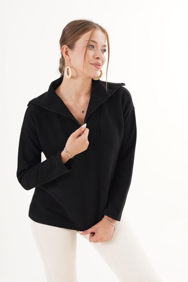 Bayan Fermuarlı V Yakalı Ve Uzun Kollu Siyah Kazak (LUS10976)