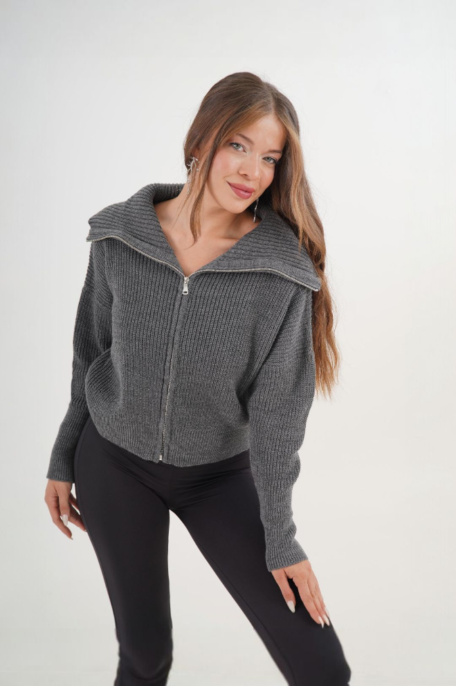 Bayan gri fermuarlı hırka, modern ve rahat tasarımıyla günlük kombinlerinizde şıklığı öne çıkarıyor.