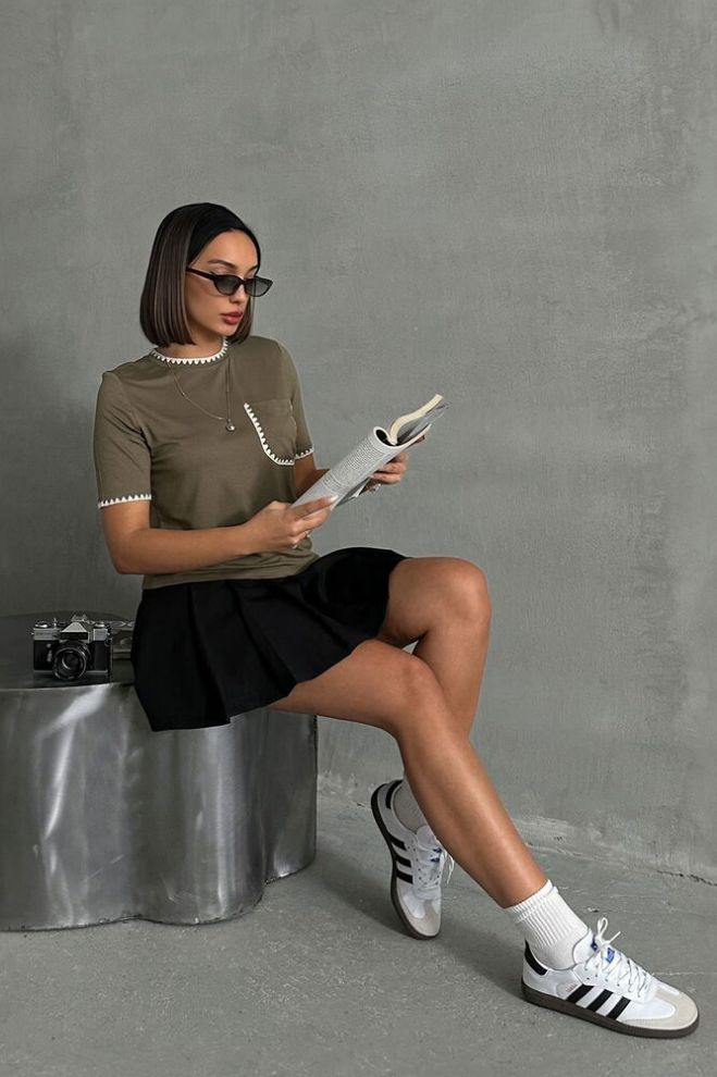 Jean pantolonlarla spor bir tarz oluşturabilir, etek veya şortlarla yaz aylarında enerjik bir görünüm elde edebilirsiniz. Haki rengin doğallığı ve beyaz dikişlerin kontrastı, tişörtü gardırobunuzun vazgeçilmez parçası haline getiriyor.