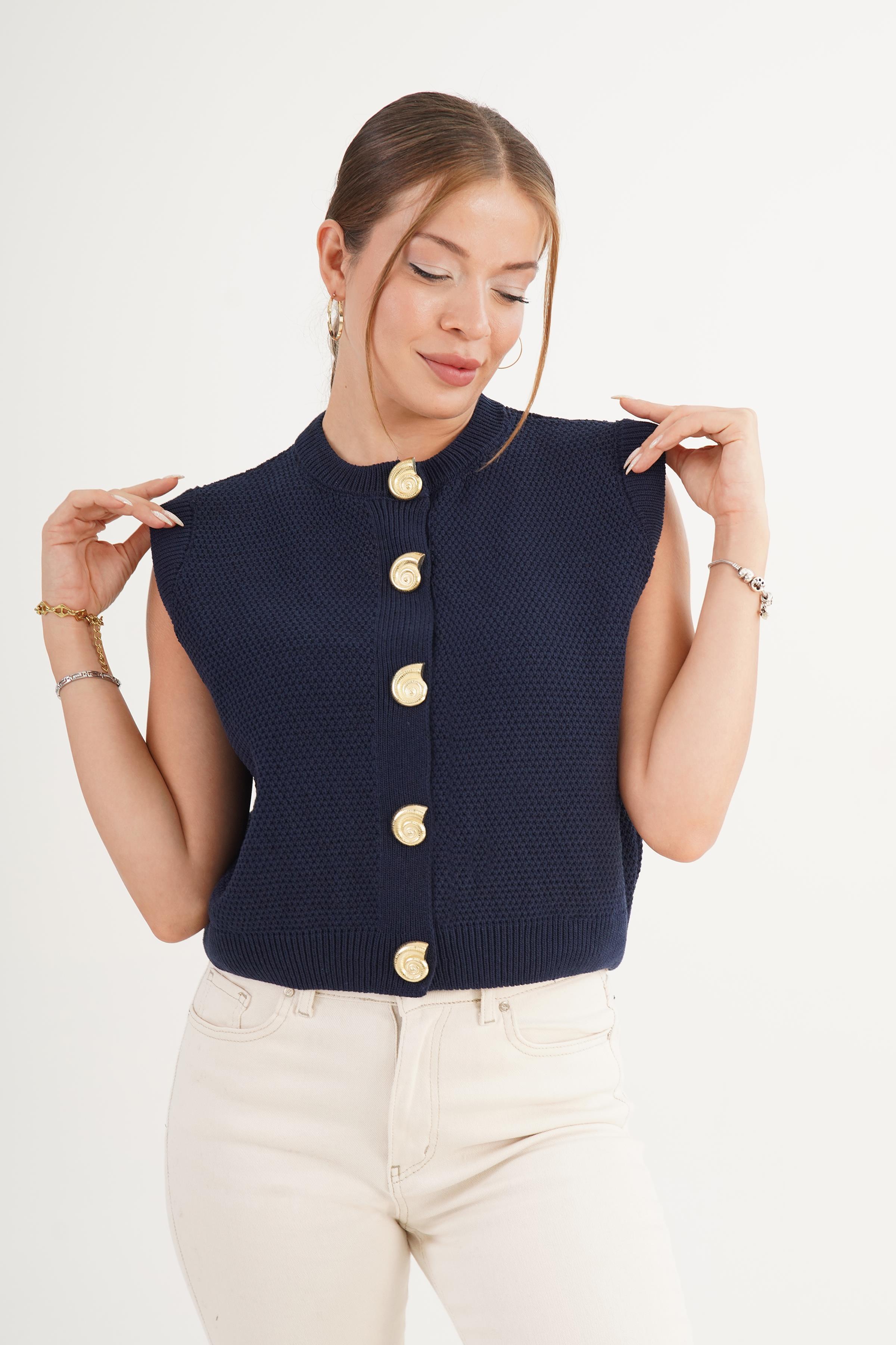Bayan Lacivert Hırka - Gündelik Zarif Düğmeli Kolsuz (LUS10957)