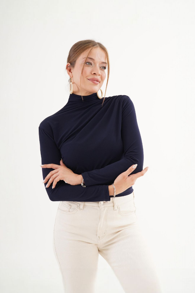 Bayan Lacivert Zarif Dar Kalıp Balıkçı Yaka Bluz