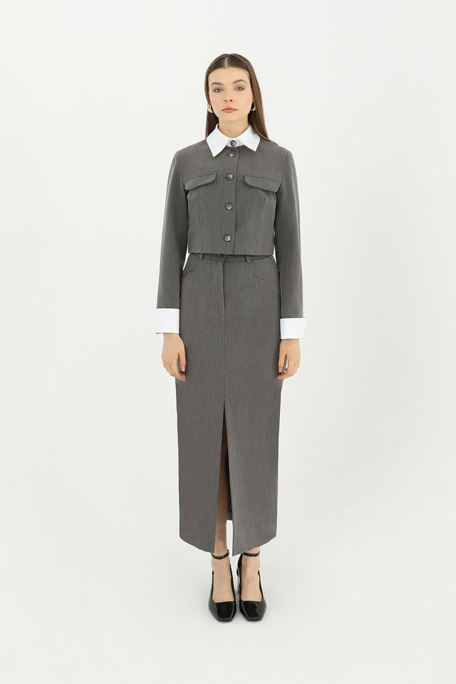 Gri rengi ve uzun boy tasarımıyla sofistike bir görünüm sunan bu kumaş etek, yırtmaç detayı sayesinde hareket özgürlüğü ve feminen bir tarz kazandırır. Kaliteli kumaş yapısı konforlu bir kullanım sunarken, klasik ve modern stilin birleşimi olarak öne çıkar. Beyaz gömleklerle ofis kombini, şık bluzlarla ise davet kombini oluşturabilirsiniz. Topuklu ayakkabılarla zarif, düz ayakkabılarla ise daha sade bir görünüm elde edebilirsiniz.