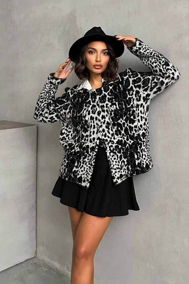 Bayan siyah beyaz triko hırka, modern tasarımı ve rahat dokusuyla günlük kombinlerinize şıklık katıyor. Siyah ve beyazın zarif uyumuyla stilinizi her ortamda öne çıkarın.