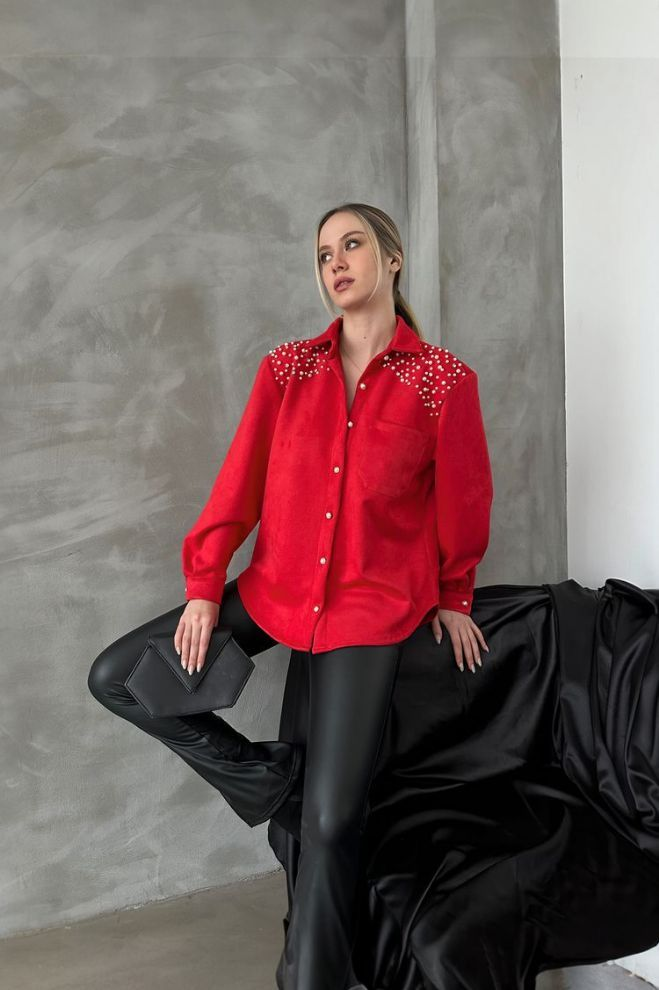 Bayan süet kırmızı taş detaylı gömlek, canlı rengi ve zarif taş işlemeleriyle kombinlerinize sofistike ve iddialı bir dokunuş katıyor. Hem günlük hem özel stil için ideal bir parça.