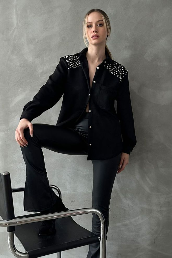 Bayan süet siyah taş detaylı gömlek, şık taş işlemeleri ve modern süet dokusuyla stilinize zarif bir ışıltı katıyor. Hem günlük hem de özel kombinler için ideal.