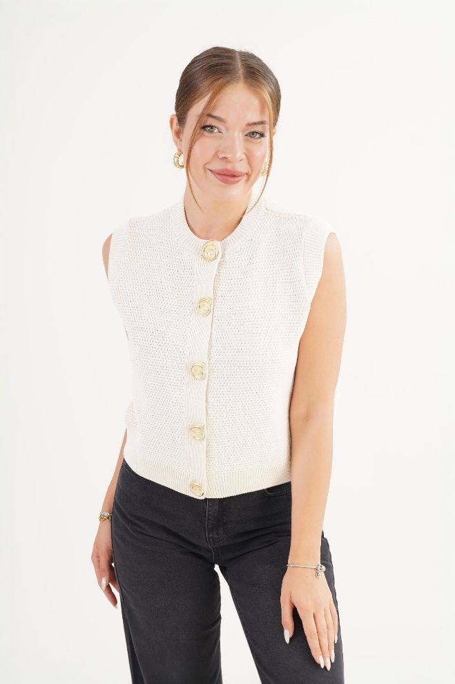 Bayan taş rengi kolsuz düğmeli hırka, sade tasarımı ve yumuşak dokusuyla gündelik şıklığı zarafetle buluşturuyor.