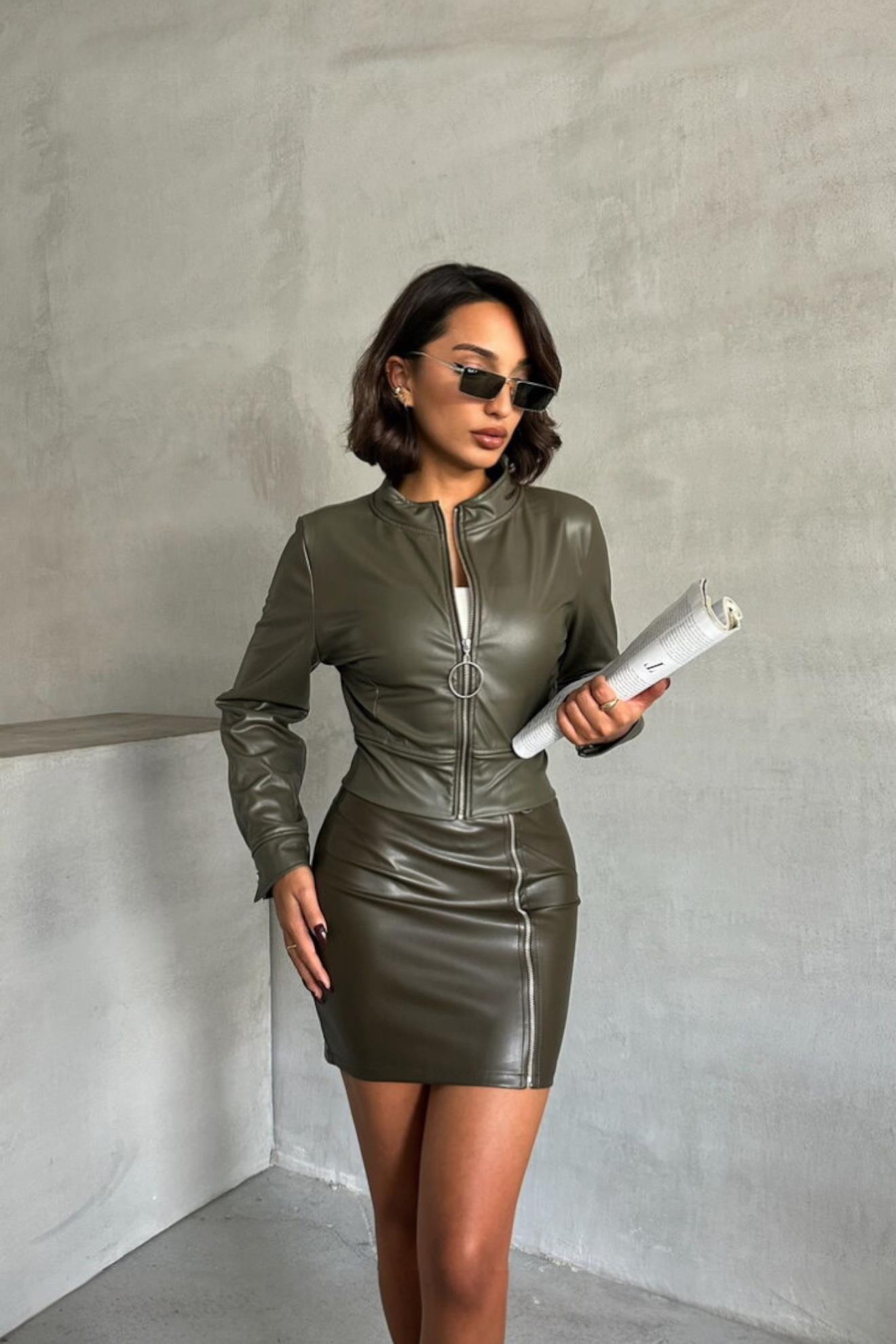 Modern çizgilere sahip haki deri mont, kısa kesimi ve parlak deri dokusuyla şehir stiline farklı bir hava katar. Fermuarlı tasarımı sayesinde pratik kullanım sağlar ve hem günlük hem de akşam kombinlerinde rahatlıkla tercih edilebilir.