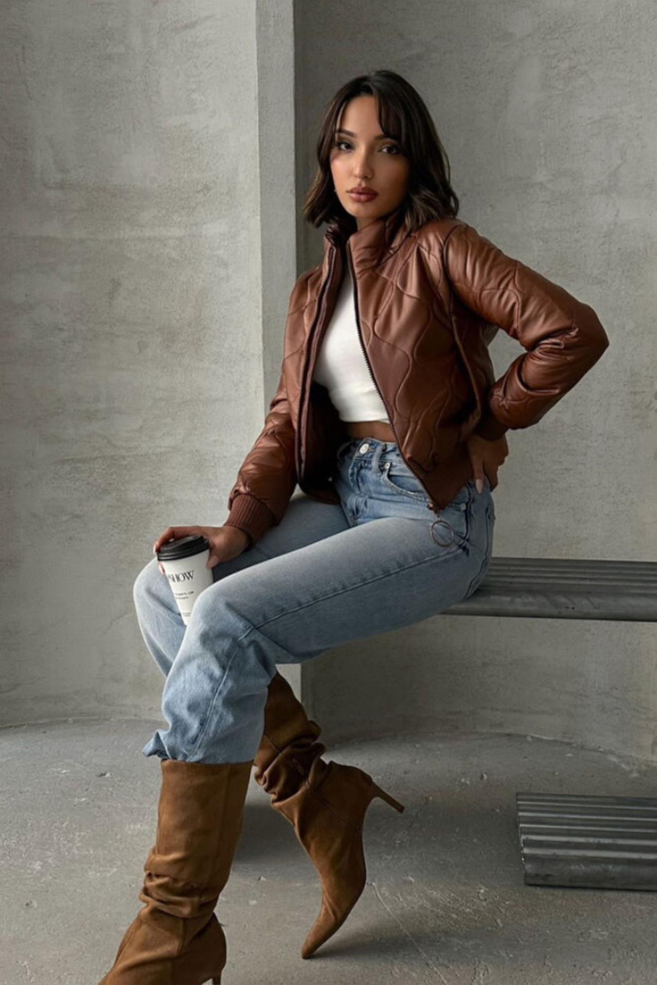 Modern tasarımı ve sportif görünümü ile öne çıkan taba fermuarlı deri mont, kapitone dikiş detayı sayesinde sıradan montlardan ayrılır. Ribanalı kolları ve beli ile rahat bir oturuş sağlar, fermuarlı tasarımı pratik kullanım sunar.