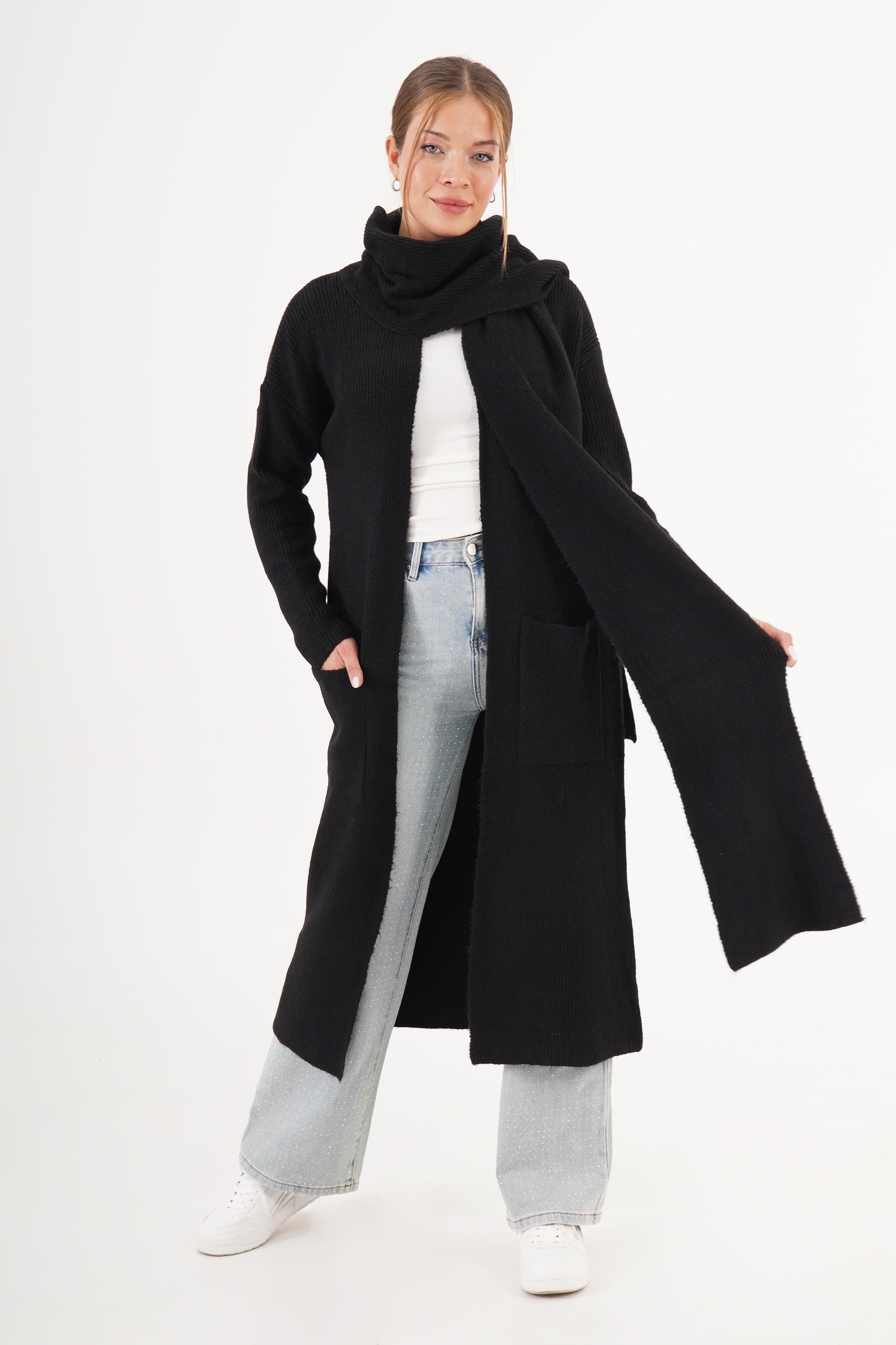 Siyah Gündelik Zarif Atkı Yakalı Uzun Hırka Yama Cep İle (LUS10966)
