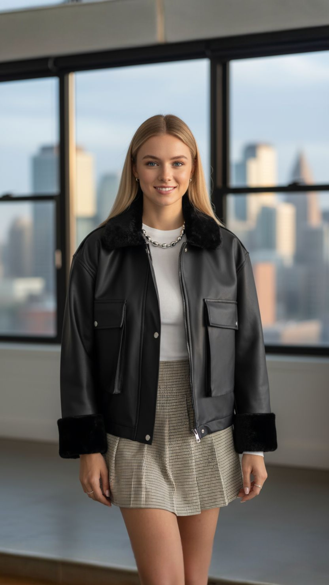 Siyah shacket ceket, gündelik zarafeti ve sokak tarzını birleştiriyor. Geniş cepleri, zarif ışıltısı ve rahat kesimiyle günlük şıklık sunarken, kürk görünümlü detayları sıcaklık katar. Mini etekler, jean pantolonlar veya elbiselerle kolayca kombinlenebilir. Hem casual hem de iddialı stiller yaratmak isteyen kadınlar için ideal bir seçimdir.